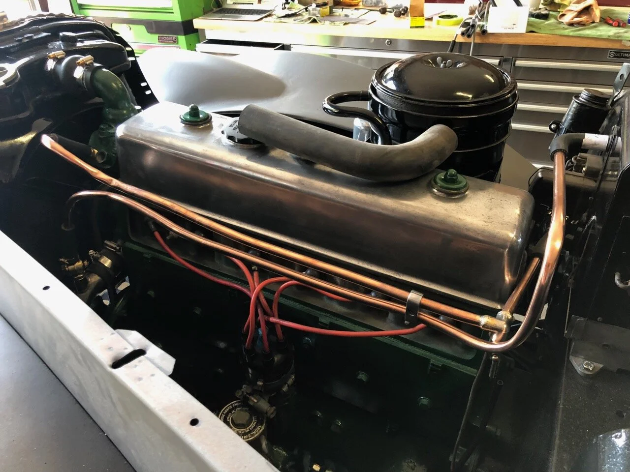 All the floors were replaced and the chassis was restored back to useable and safe condition. All brakes were rebuilt along with the lever shock absorbers. The dash wiring has been replaced and the dash is nearing readiness for the walnut burr veneer to be applied.